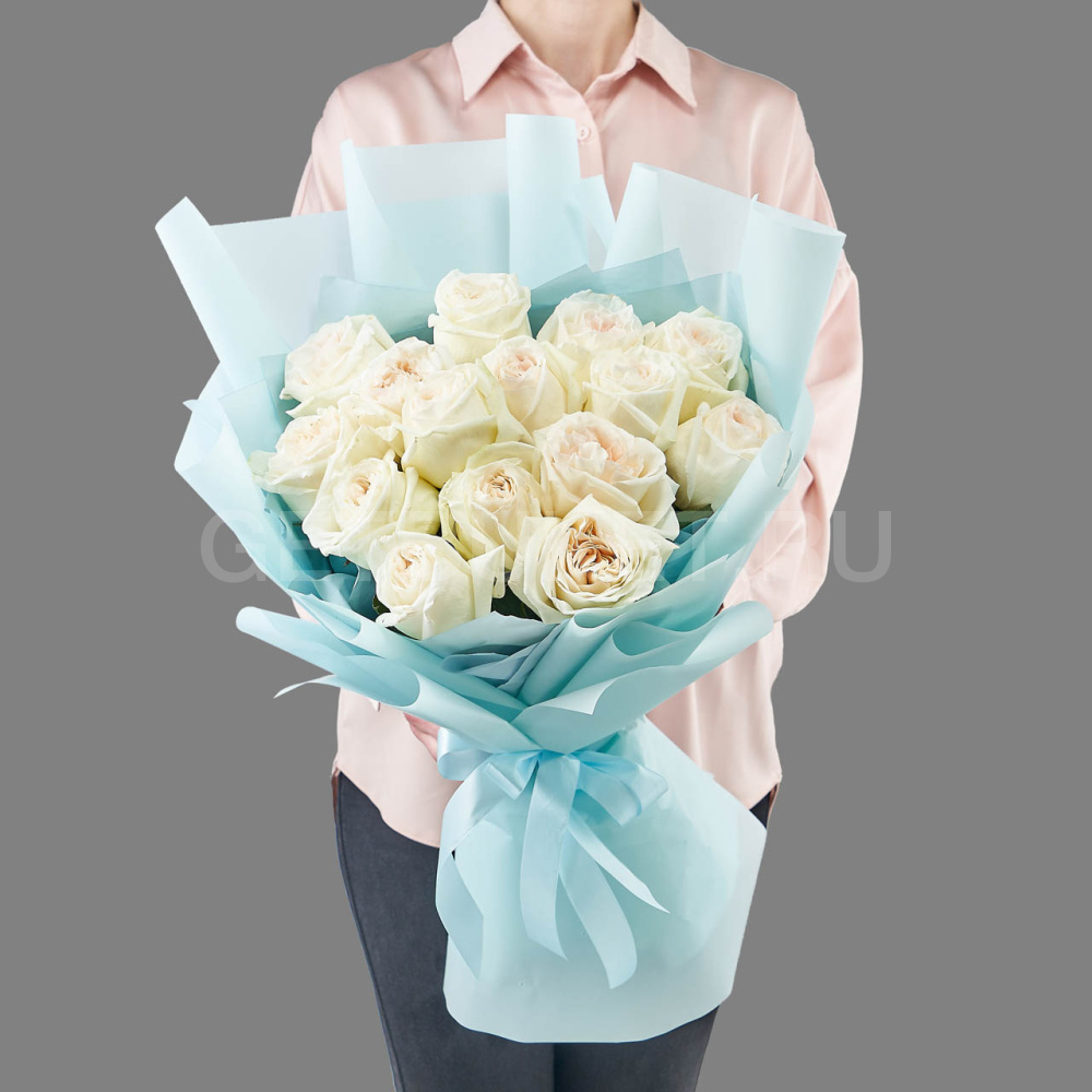 Букет из 15 белых пионовидных роз в упаковке