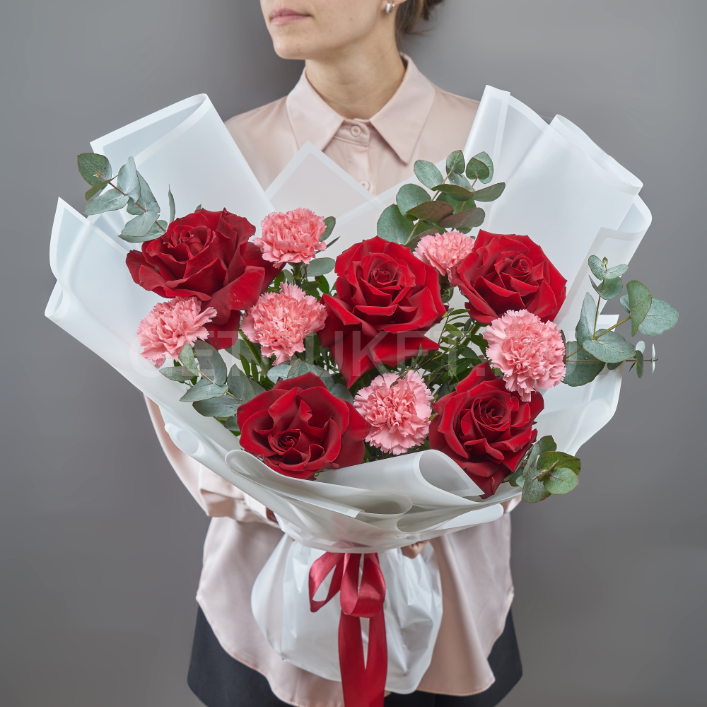 Букет с гвоздиками, розами и альстромерией6 090 ₽Букет с гвоздиками, розами и альстромерией 6 090 ₽ -