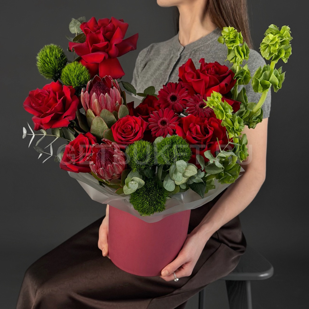 Цветочная композиция из красных роз, молюцеллы и протеи в шляпной коробке