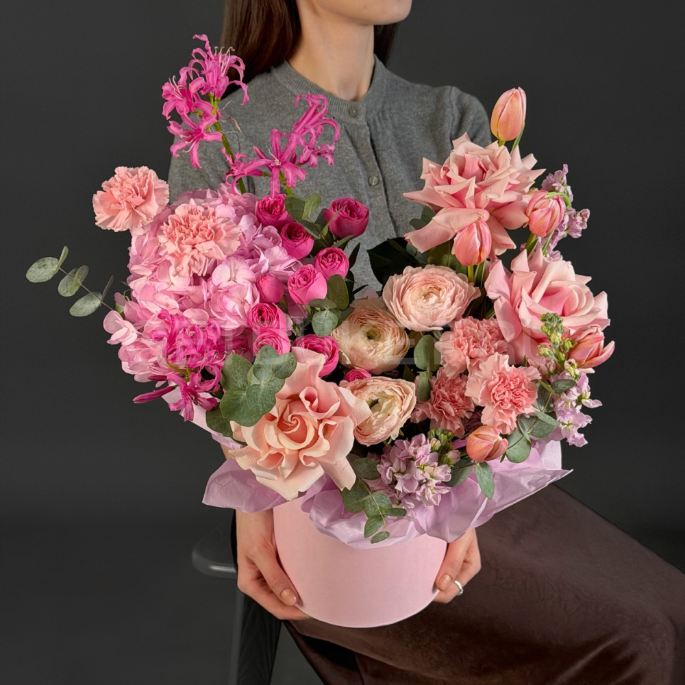 Цветочная композиция из роз, ранункулуса и нерине в шляпной коробке