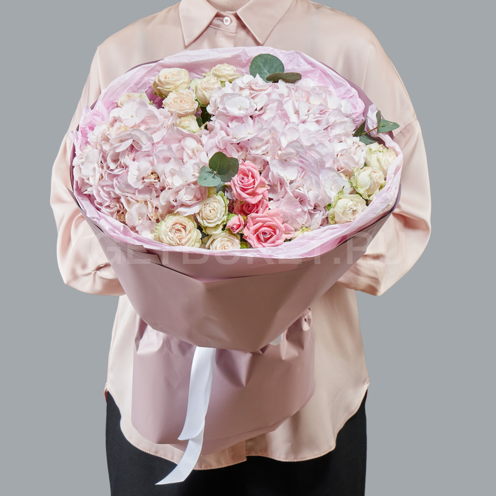 Букет из роз, гвоздик и розовой гортензии с эустомой13 800 ₽Букет из роз, гвоздик и розовой гортензии с эустомой 13 800 ₽ -