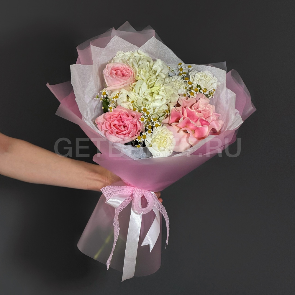 Букет белой гортензии с розами, гвоздикой и танацетумом