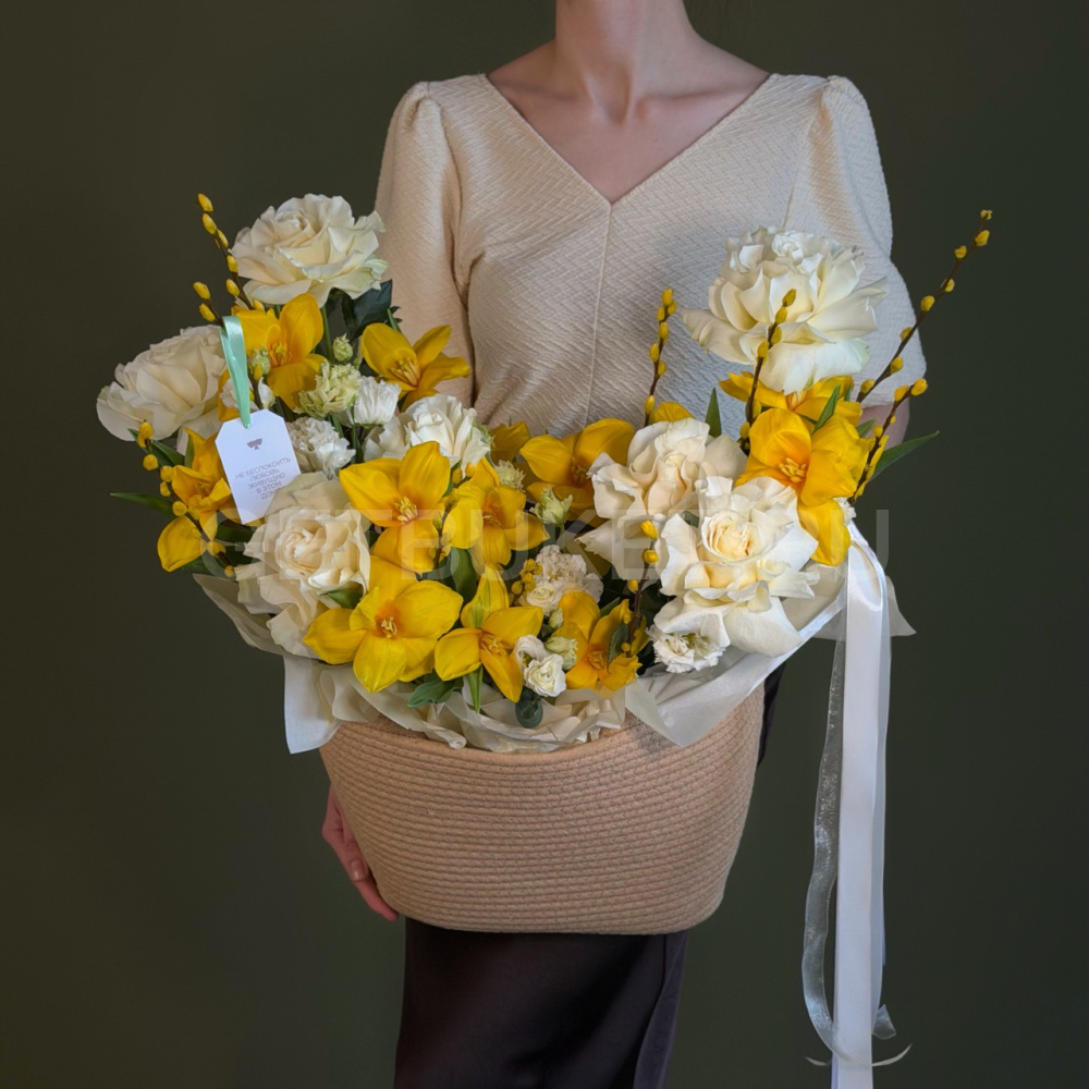 Цветочная композиция с гвоздиками, нарциссами и вербой в плетеной корзине4 000 ₽Цветочная композиция с гвоздиками, нарциссами и вербой в плетеной корзине 4 000 ₽ -