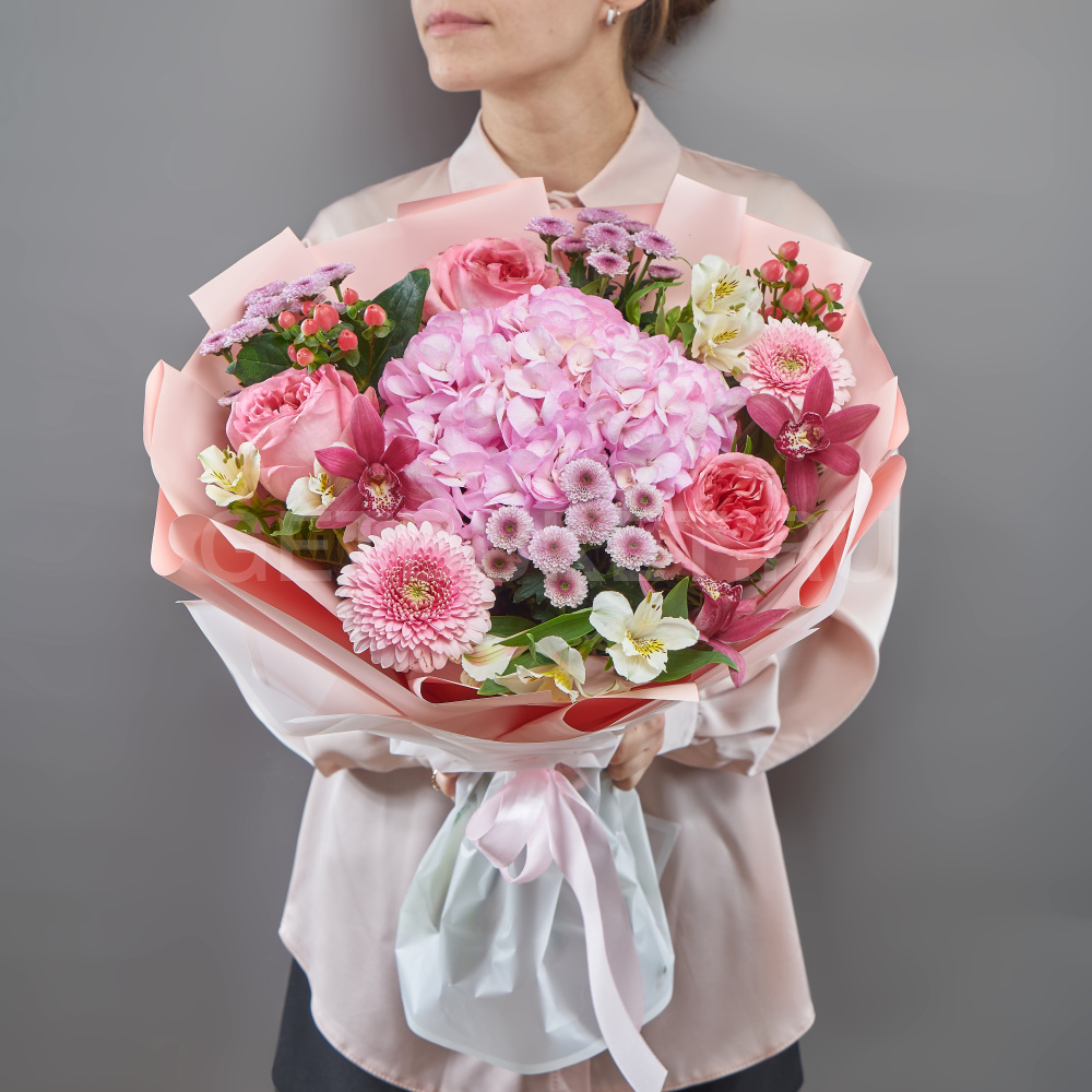 Букет из роз, гвоздик и розовой гортензии с эустомой13 800 ₽Букет из роз, гвоздик и розовой гортензии с эустомой 13 800 ₽ -